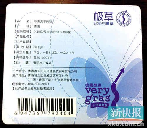 而且,由于目前国内消费者对于合格保健品的鉴别能力并不高,保健品种类又很多,其安全性的辨别非常重要,所以国家规定,凡声称具有保健功能的食品必须经相关部门审查确认、审批,对审查合格的保健品发给《保健品批准证书》;外包装上有国家保健品标志——业内称“淡蓝色牛头标志”(小蓝帽),这是确定一个保健品是否合格安全的最基本条件。而记者在极草5X冬虫夏草系列产品的外包装上,并未看到保健品认证标签,即小蓝帽标志。