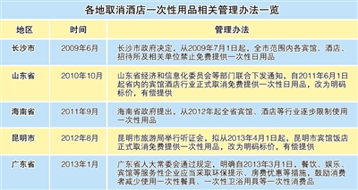 据了解,很多地方都曾倡导过取消、减少一次性用品的提供,或者让一次性用品有偿使用。在酒店业发达的广东,一直在努力探索。2010年3月,广东省旅游局发布《关于我省星级饭店逐步取消一次性用品的通知》,要求不再将一次性用品配送至客房,同时还规定2010年10月1日后正式取消免费提供一次性日用品。而这份通知似乎没有得到有力执行。免费一次性用品退出酒店业为何这么难?近日,记者去广东多家酒店进行调查。