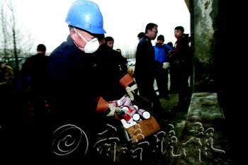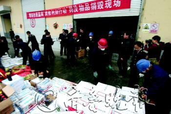 现场,随着“销毁开始”命令的下达,戴着手套和专业防尘口罩的工作人员迅速将待销毁的产品逐一搬起,扔到焚烧前的窑坑里。
