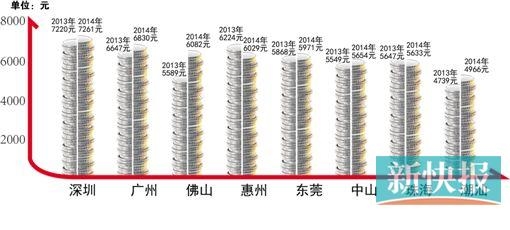 其他城市,佛山由去年的第六位跃居第三位,平均月薪6082元,赶超了惠州(6029元)、东莞(5971元);中山、珠海、潮汕地区平均月薪则分别为5654元、5633元、4966元。调查还显示,惠州、珠海平均月薪有下降趋势,其中惠州比2013年下降约为3.1%。