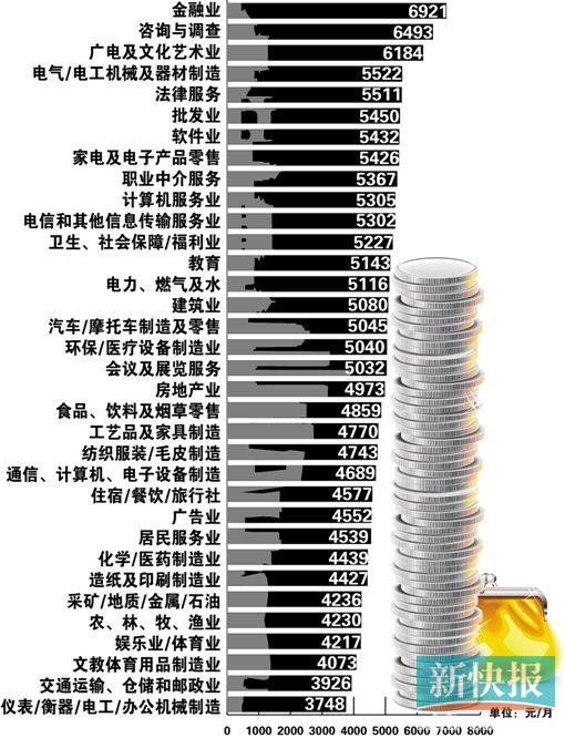 调查显示,34个行业中月薪前五的行业,依次是金融业(6921元)、咨询与调查(6493元)、广电及文化艺术业(6184元)、电气/电工机械及器材制造(5522元)、法律服务(5511元)。排名末五位的行业则有:农、林、牧、渔业(4230元),娱乐业/体育业(4217元),文教体育用品制造业(4073元),交通运输、仓储和邮政业(3926元),仪表/衡器/电工/办公机械制造(3748元).