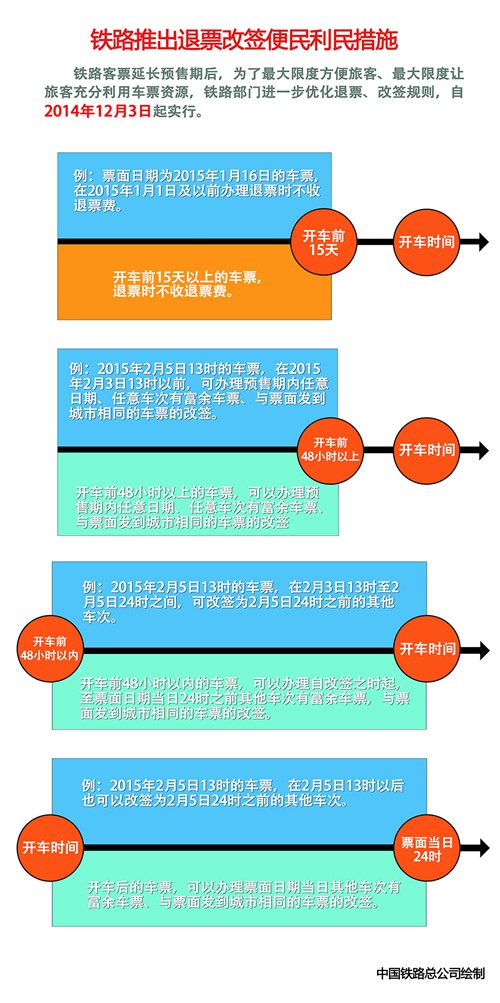 人民网11月30日电(记者 李楠楠)铁路客票延长预售期后,为了最大限度方便旅客、最大限度让旅客充分利用车票资源,铁路部门进一步优化退票、改签规则,自2014年12月3日起实行。
