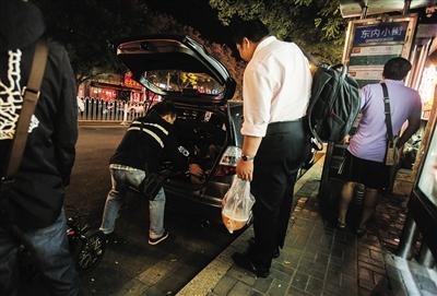 9月25日,簋街,一名代驾把自己的脚踏车放进雇主的后备厢。