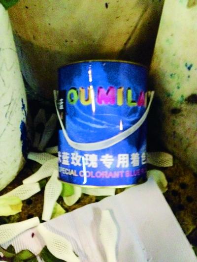 在王强的展示下,记者看到制作蓝色玫瑰的着色剂是一个约5升的塑料桶,花卉着色剂的名称旁边标注着“奥米蓝”的颜色表述。