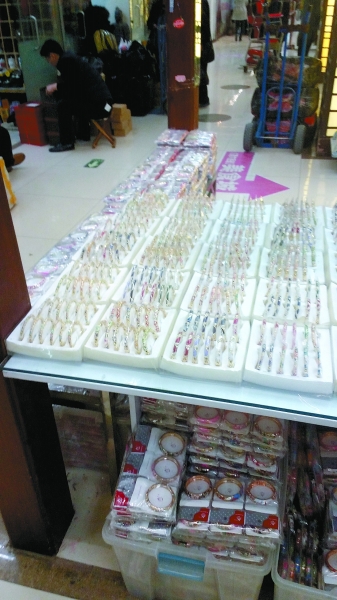 那些在大多数景区都有出售的“玉”手镯,摊位上标价10元一只。在义乌,它们的平均身价约每只1至2元。本着“量大价低”的批发原则,一只“玉”手镯的单价甚至能不到1元。
