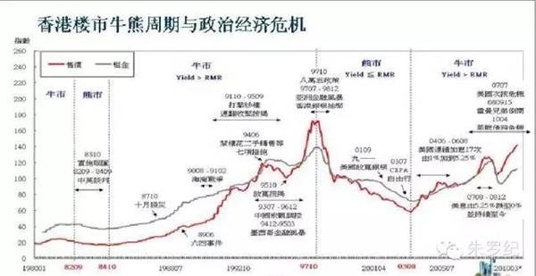 但问题是,亚洲金融风暴之前和SARS危机之后,香港房价涨了多少年?亚洲金融风暴之前,香港房价也有好几次牛市熊市,但基本都是“小熊大牛”。