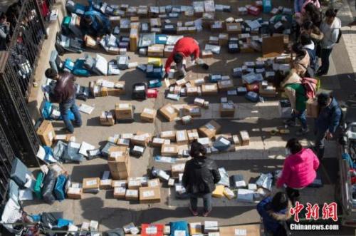2016年“双11”后各地迎来快递派送高峰。图为工作人员忙着分拣满地的快递。武俊杰 摄