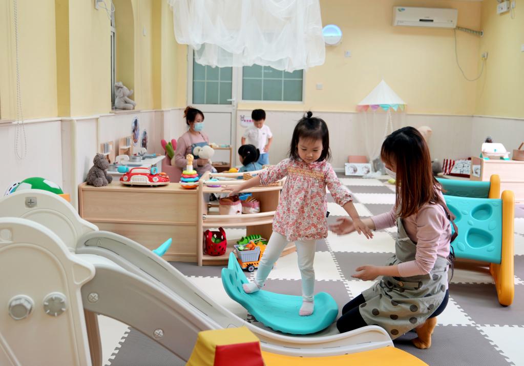 2022年11月1日,在新建成的浙江省杭州市西湖区北山街道托育中心,老师带着小朋友们玩游戏。该托育中心主要招收0至3岁的婴幼儿。新华社记者江汉 摄