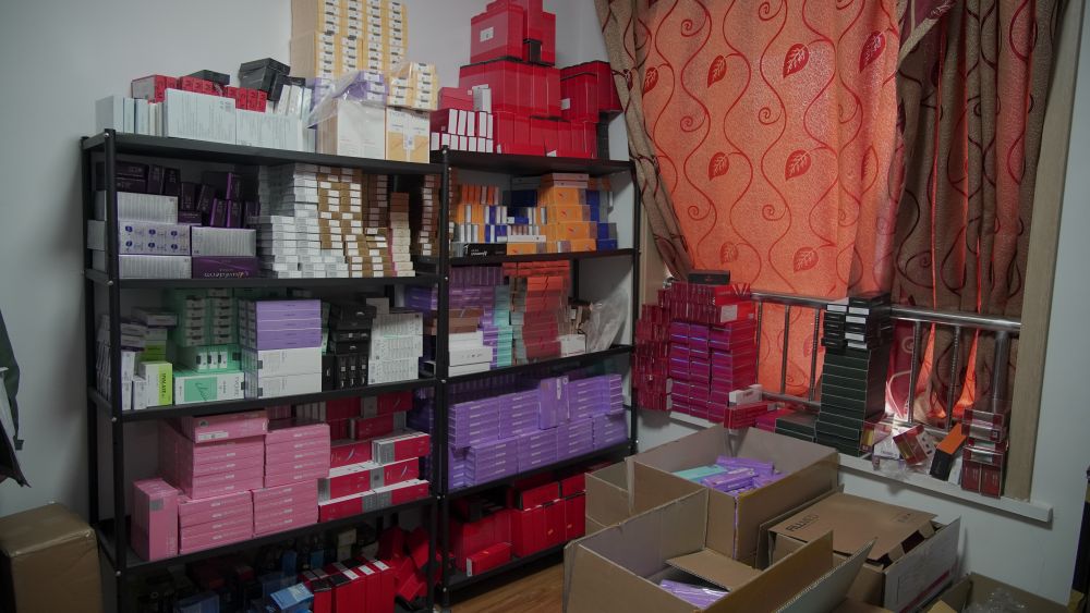 龚某出租屋内货架上堆放的肉毒素、水光针等产品。(兰州市公安局治安支队食药侦大队供图)
