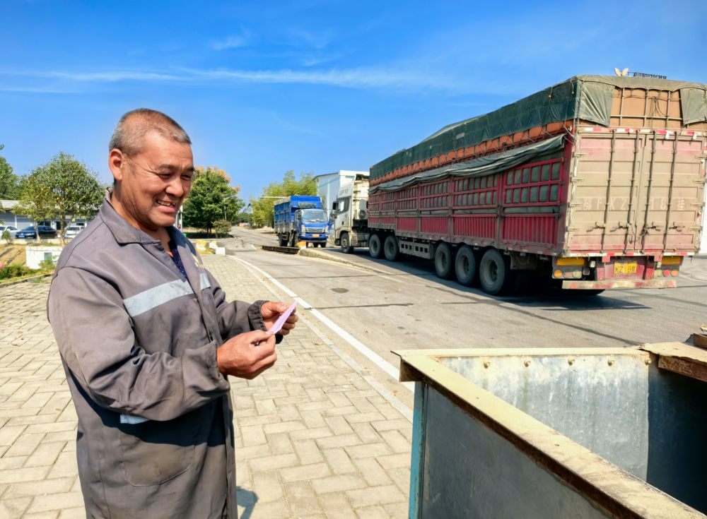 几辆大车中,李忠才那辆“娇小”的农用三轮车,格外显眼。李忠才高高的个头,穿着一件沾满泥灰的外套,就靠在车边,金灿灿的稻谷把车斗填得满满当当,也映衬着他的笑脸。