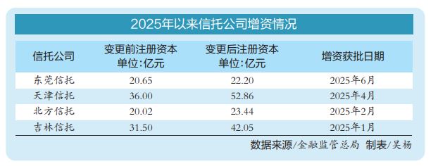 又一家信托公司实现增资。东莞金融监管分局近日批复,同意东莞信托有限公司增加注册资本1.55亿元,由20.65亿元变更为22.20亿元。这是继2024年6月增资约4.09亿元之后,东莞信托的又一次资本补充。记者注意到,今年以来已有4家信托公司增资获批,为自身发展注入新动能。