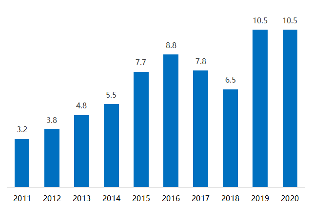 2011-2020年中国100马力以上拖拉机行业销量(万辆)