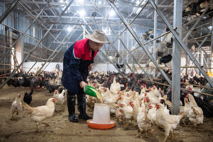 “Z世代”年轻人蒋连超在湖南沅江市胭脂湖街道南竹山村喂鸡。大学毕业后,他选择成为南竹山村的“乡村合伙人”,凭借自己念书期间积累的丰富创业经验,带领村民办农庄、搞养殖、进行当地农产品销售的网络化运营。新华社记者 陈思汗 摄
