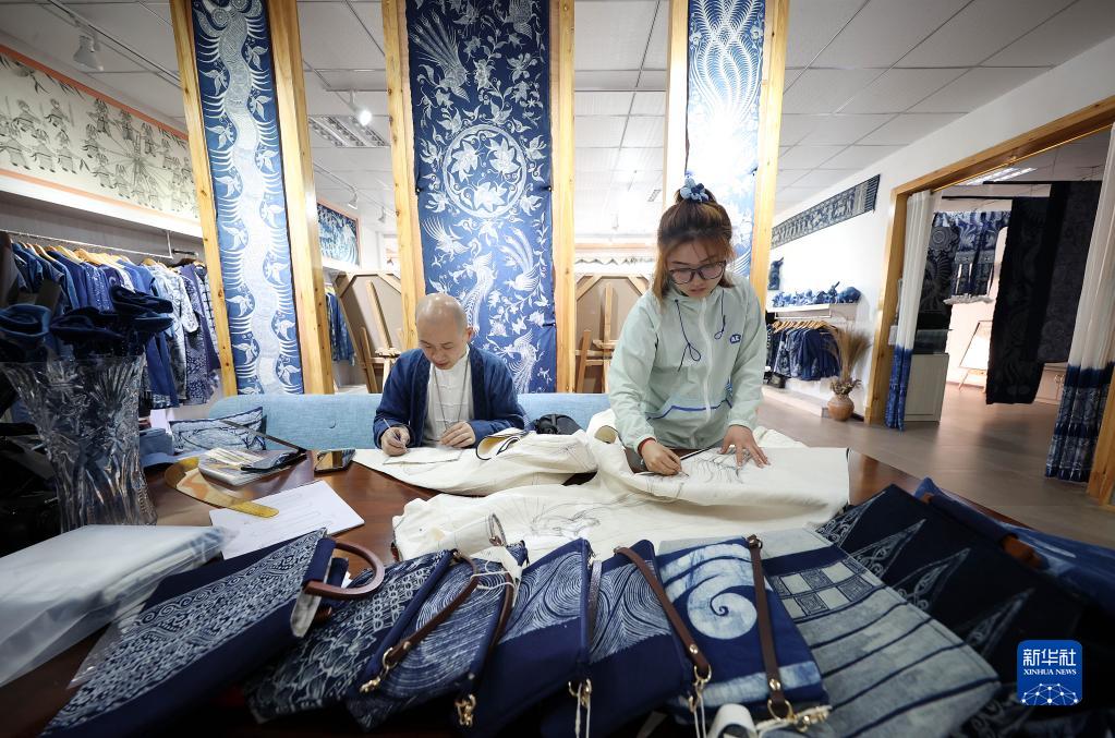 2022年4月7日,在贵州省黔东南苗族侗族自治州丹寨县宁航蜡染非遗工坊,服饰设计师在设计蜡染产品。新华社发(黄晓海 摄)