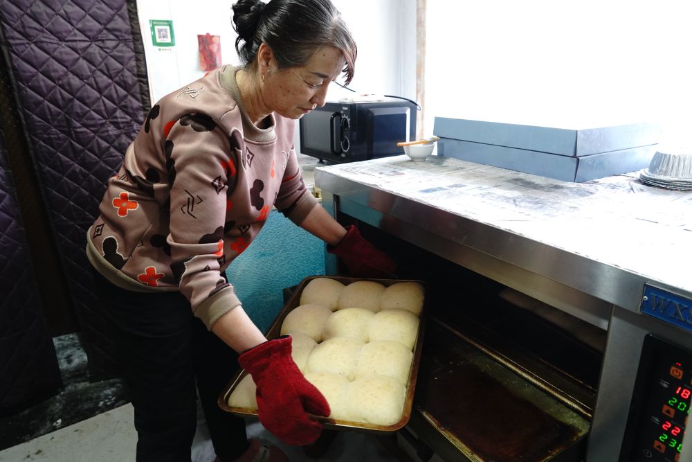 赵银华把面包从烤箱取出。新华社记者 王鹤 摄