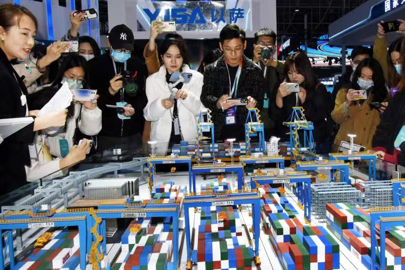 4月6日,参观者在展会上了解数字无人码头。