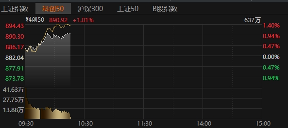 10月11日10时15分,科创50指数涨超1%,涨幅达到1.01%。
