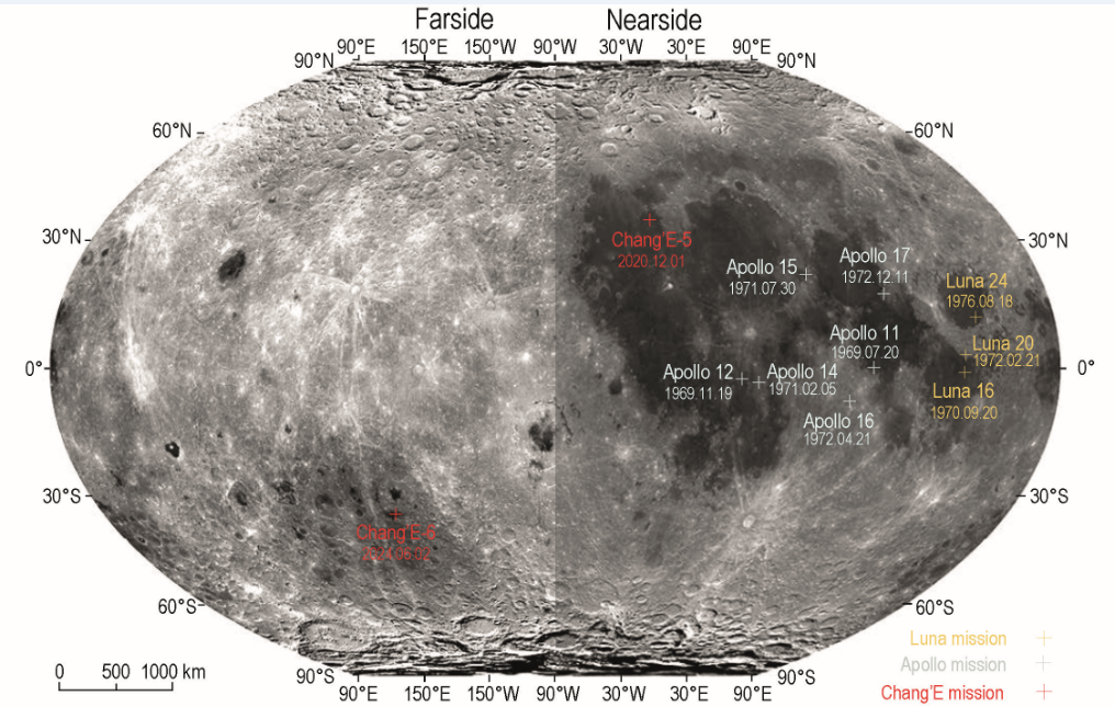 嫦娥六号与嫦娥五号、美国Apollo计划及苏联Luna计划落点示意图。(中国科学院国家天文台供图)
