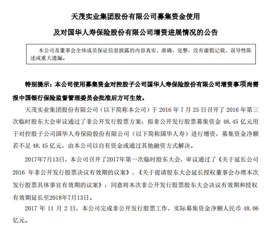 根据公告,早在2016年7月,天茂集团便将定增方案提上日程,拟募资48.45亿元对国华人寿增资。2017年11月,定增完成,实际募资净额48.06亿元。