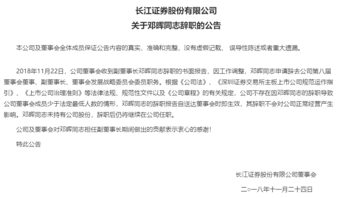 而在去年12月,邓晖便辞去了长江证券总裁一职。邓晖是长江证券第一批员工,虽然公司称此次卸任是由于“工作调整”,但邓晖彻底退出董事会、淡出核心管理层,外界认为与长江证券的控制权之争不无关系。