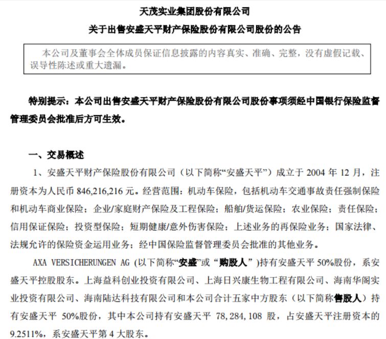 11月26日,天茂集团和其余4家股东同时与安盛签订了股份出售和购买协议,5家股东将合计持有的安盛天平50%股份出售给安盛。出售完成后,原本持有安盛天平50%股权的安盛将对其100%持股。