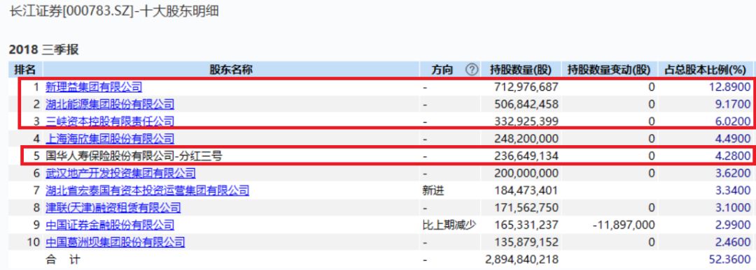长江证券2018年三季报数据,其第一大股东新理益集团、第五大股东国华人寿持股比例分别为12.89%和4.28%,共计17.17%;而第二、第三大股东湖北能源和三峡资本分别持股9.17%和6.02%,共计15.19%。