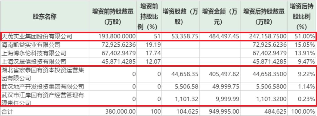 三家公司均以自有资金出资,其中湖北宏泰出资40.55亿元,增资后持股占比9.22%;武汉地产出资5亿元,增资后持股占比1.14%,江岸国资出资1亿元,增资后持股占比0.23%。