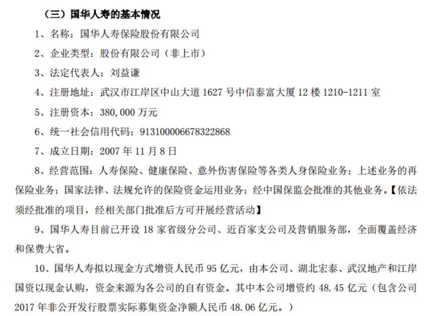 国华人寿此次增资引入的另外三家股东均为国资背景,分别是湖北省宏泰国有资本投资运营集团有限公司、武汉地产开发投资集团有限公司、武汉市江岸国有资产经营管理有限责任公司。