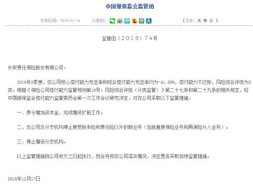 监管函显示,该公司因2018年三季度偿付能力不达标、风险综合评级为D类,被银保监会责令增资扩股,停止接受除车险和责任险以外的新业务,并停止增设分支机构。