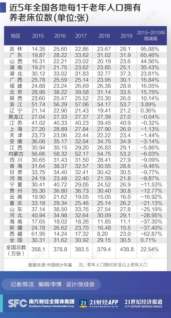 从数据上看,由于老龄化发展过快,很多地方颇有点“猝不及防”。根据《中国统计年鉴》,近5年以来,全国60岁以上老年人的人均养老床位从2015年的30.31张/千人,小幅上涨到2019年的30.5张/千人,但31个省区市中,有20个地区人均床位下降,其中5个地区降幅超过25%。