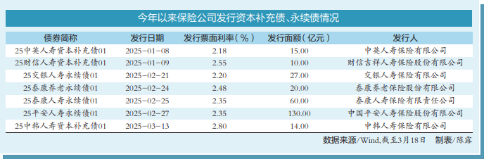 部分保险公司则通过发行资本补充债“补血”。Wind数据显示,截至3月18日,今年以来,中英人寿、中韩人寿、财信人寿发行了资本补充债,合计规模39亿元。以此来计算,截至3月18日,今年以来保险公司合计发行资本补充债、永续债的规模接近280亿元。