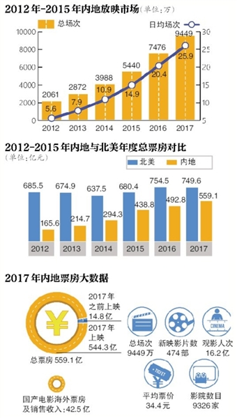 559.1亿。当去年中国电影年度总票房数据最终停留在这个数字上时,业内业外都为影市回暖取得的成绩倍感振奋。虽然最终年票房未能突破600亿的“小目标”,但如今的成绩也无疑是张华丽的成绩单,依然创下了历史新高。纵观2017年内地取得的票房成绩已是北美票房(全年110.66亿美元,折合749.6亿人民币)的3/4,可见中国市场全面超过北美、成为全球第一大电影市场应该指日可待。如此漂亮的成绩单背后有怎样的数字秘密,票房的贡献来源于谁?档期风云争霸赢家是谁?黑马频出的一年影片各有何贡献?观众品位日益提高的又有什么新的受众特点?对此,新京报采访多位业内人士,独家梳理2017年电影票房表现,罗列重点数据,盘点影片及市场表现,总结成绩及发展走向、各影市公司业绩及热门电影事件。