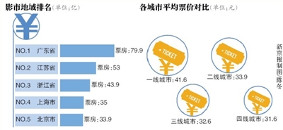 从全国票房来看,各省大盘都有实现增长,增幅超过30%的省份有8个,增长最多的是广东(增加了13.3亿);增幅最大的是海南,达35.6%。全国主要票仓依旧是广东、江苏、浙江、上海、北京这五个省市,它们合共的票房占比达45%。票房前五的城市(上海、北京、广州、深圳、成都)票房占全国城市总票房28%,但一线城市的票房同比增长不到15%,已经趋于饱和。