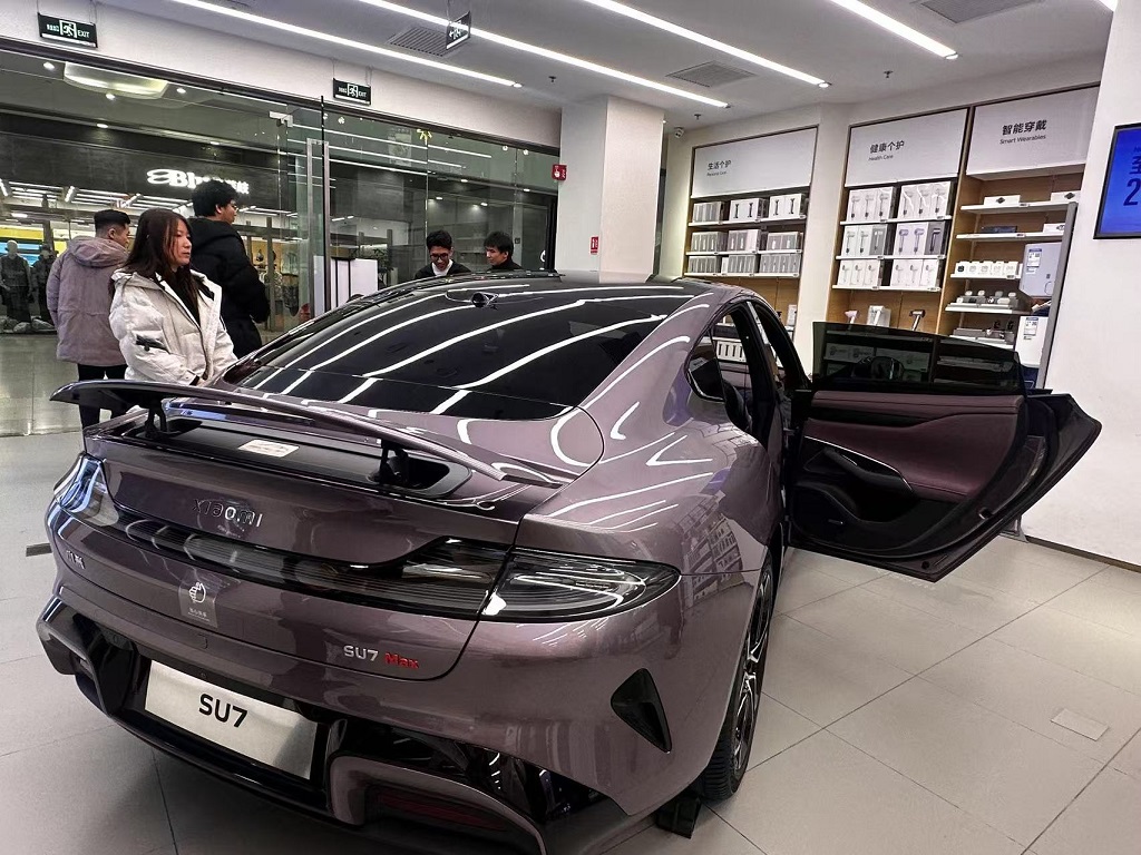 消费者在小米销售门店看车。 本报记者 李嫒嫒 摄