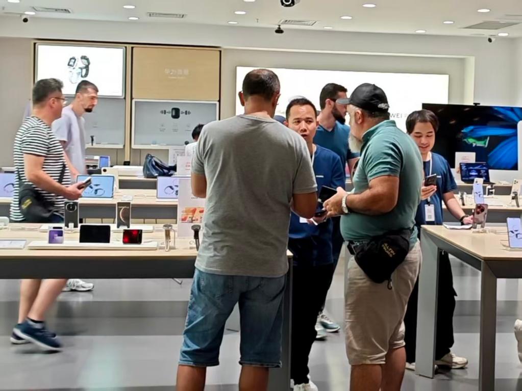 在一家华为门店里,10多名外国顾客正体验产品,有人还用纸笔认真记下参数与价格。店员钟海康说:“广交会期间来的外国客人‘数都数不过来’,店里最受欢迎的是智能穿戴产品。一些客人到店加了微信后,还会线上复购,我们直接送货到他们住的酒店。”