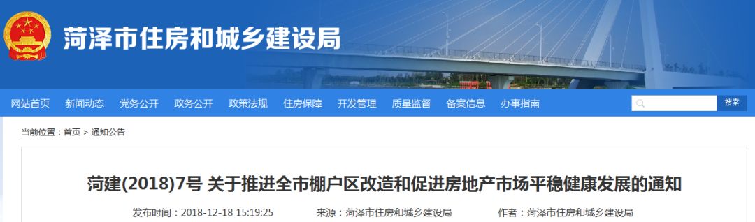 12月18日下午,山东省菏泽市住房和城乡建设局网站发布了《关于推进全市棚户区改造和促进房地产市场平稳健康发展的通知》(后简称为《通知》),在限制新购住房转让限制与降低市区商品房预售资金监管方面较此前房地产调控政策大幅松绑。