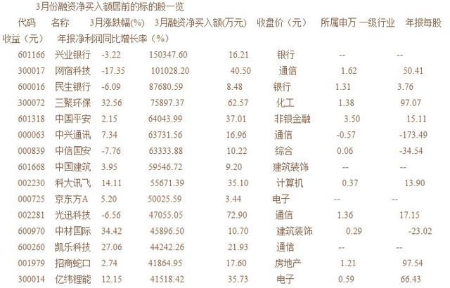 从两融标的股3月份融资买卖情况来看,959只两融标的股中,有490只两融标的股在此期间处于融资净买入状态,占比51.09%。其中,有108只两融标的股期间融资净买入额超亿元,而兴业银行、网宿科技、民生银行、三聚环保、中国平安、中兴通讯、中信国安、中国建筑、科大讯飞、京东方A等两融标的股期间融资净买入额位居前十,分别为:15.03亿元、10.10亿元、8.77亿元、7.59亿元、6.40亿元、6.37亿元、6.33亿元、5.95亿元、5.57亿元和5.00亿元。