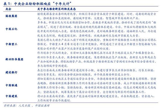 在新区宣布设立的一周内,已经有包括国投集团、中国石化、中船重工、新兴际华集团、建设银行、中国联通、中国建筑等近30家央企结合自身业务特点,制定相应的发展规划,积极参与到新区建设中来。“千年大计”的号召力十分强大。