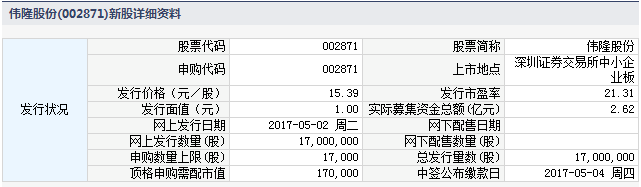 根据交易所公告,青岛伟隆阀门股份有限公司于2017年5月2日进行网上申购。本次公开发行股票总数量1,700万股,网上发行1,700万股,占本次发行总量的100%。本次发行股份全部为新股,不安排老股转让。