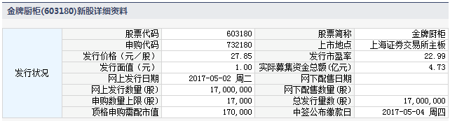根据交易所公告,厦门金牌厨柜股份有限公司于2017年5月2日进行网上申购。本次发行股份数量为1,700万股,全部为新股,网上发行数量为1,700万股,占本次发行数量的100%。