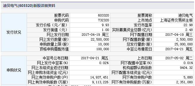 根据交易所公告,浙江迪贝电气股份有限公司于2017年5月2日起在上海证券交易所主板上市。