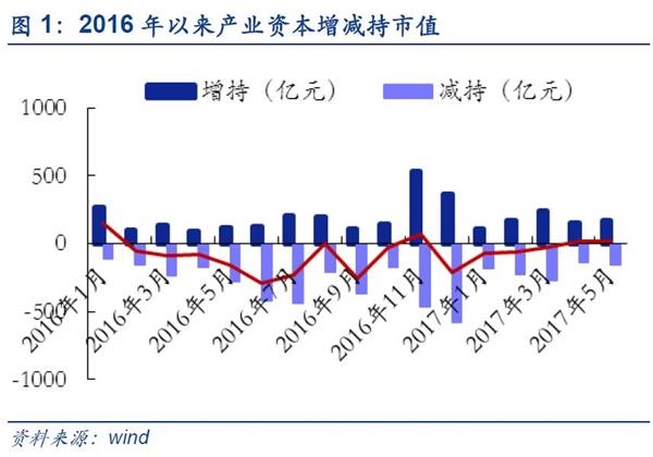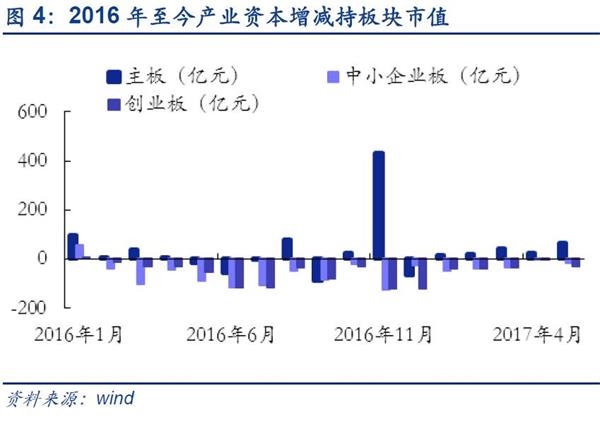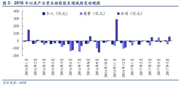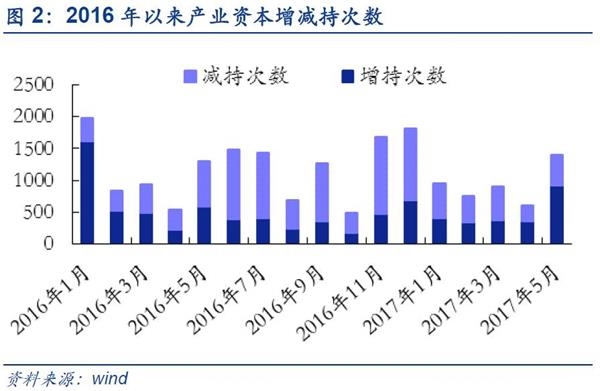 ■板块角度:5月全部A股产业资本延续净增持18.72亿元,主板净增持进一步扩大。2016年12月至今产业资本增持状况不断改善,并在今年4月由净减持转为净增持,5月份继续保持净增持。截至2017年5月31日,5月产业资本净增持18.72亿元,较上月环比下滑16.33%;增减持次数达1394次,环比四月大幅上升133%,其中增持次数明显增多,达919次。中小创持续减持,产业资本更加偏好主板。5月主板扩大净增持,5月主板净增持66.44亿元,较上月环比增长163.13%;中小板持续净减持,中小板净增持-17.04亿元,较上月环比下滑977.70%;5月创业板持续净减持,创业板净增持-30.68亿元,较上月环比下滑2272.56%。主板产业资本增持明显高于中小创。其中,主板连续5个月净增持并且增持规模不断扩大; 2017年以来中小创净减持规模收缩,4月份规模缩至低位,5月份有所抬头。结合5月各板块市场表现,说明相较于中小创,目前产业资本更加偏好主板公司。