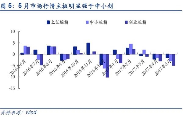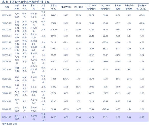 中小创持续减持,产业资本更加偏好主板。5月主板扩大净增持,5月主板净增持66.44亿元,较上月环比增长163.13%;中小板持续净减持,中小板净增持-17.04亿元,较上月环比下滑977.70%;5月创业板持续净减持,创业板净增持-30.68亿元,较上月环比下滑2272.56%。主板产业资本增持明显高于中小创。其中,主板连续5个月净增持并且增持规模不断扩大; 2017年以来中小创净减持规模收缩,4月份规模缩至低位,5月份有所抬头。结合5月各板块市场表现(上证综指下跌1.41%,中小板下跌2.98%,创业板指下跌4.92%),说明相较于中小创,目前产业资本更加偏好主板公司。