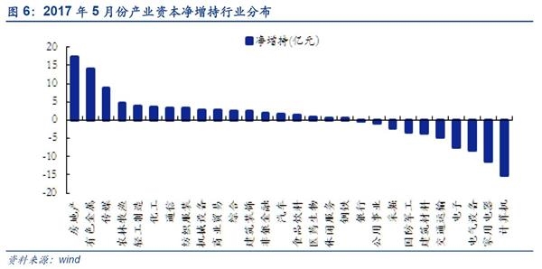 ■行业角度:5月周期股由增持转减持,消费出现下滑迹象。5月金融、消费、稳定、周期、成长净增持额分别为20.62亿元、20.53亿元、3.41亿元、-0.85亿元、-33.13亿元。其中,金融、成长股净增持额较4月环比上涨15.51%、11.33%;稳定风格由净减持转为净增持(4月为-5.62亿元);消费风格产业资本净增持略微下滑0.20%;周期风格产业资本由净增持转为净减持(4月为51.31亿元).