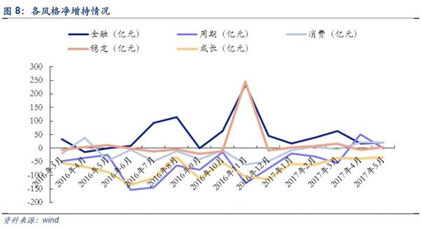 5月周期股由增持转减持,消费出现下滑迹象。5月金融、消费、稳定、周期、成长净增持额分别为20.62亿元、20.53亿元、3.41亿元、-0.85亿元、-33.13亿元。其中,金融、成长股净增持额较4月环比上涨15.51%、11.33%;稳定风格由净减持转为净增持(4月为-5.62亿元);消费风格产业资本净增持略微下滑0.20%;周期风格产业资本由净增持转为净减持(4月为51.31亿元).
