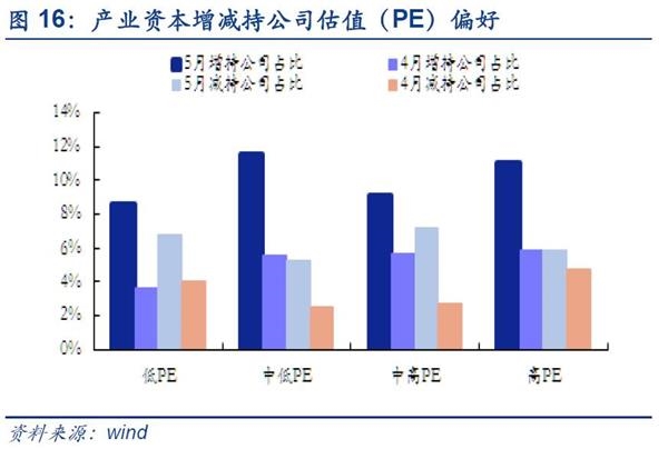 (1)增持方面,5月产业资本对中高市值板块的关注逐步提升。从市值角度,增持公司在中小市值占比为10.03%,略高高于其他市值(小市值9.23%、中高市值8.54%、高市值5.48%);从市盈率来看,增持公司在中低估值的占比为11.54%(低PE8.65%,中高PE9.13%,高PE11.06%);从业绩来看,增持公司明显集中在业绩较差的公司,其中在业绩明显下滑的占比为11.20%(下滑10.36%、提升7.99%、较快提升9.01%、明显提升8.56%,超高速提升8.64%)。值得注意的是虽然5月产业资本依然相对集中在市值偏小且业绩偏差的公司,但中高市值增持占比正在明显增长(4月1.23%→8.54%).