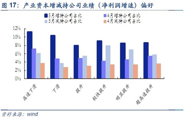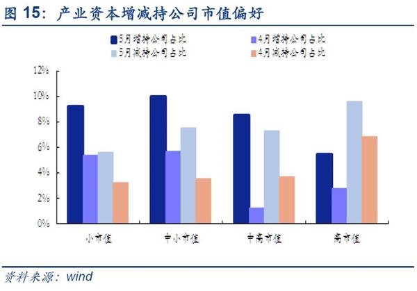 ■个股角度:增持方面,5月产业资本对中高市值板块的关注逐步提升。从市值角度,增持公司在中小市值占比为10.03%,略高高于其他市值(小市值9.23%、中高市值8.54%、高市值5.48%);从业绩来看,增持公司明显集中在业绩较差的公司,其中在业绩明显下滑的占比为11.20%(下滑10.36%、提升7.99%、较快提升9.01%、明显提升8.56%,超高速提升8.64%)。值得注意的是虽然5月产业资本依然相对集中在市值偏小且业绩偏差的公司,但中高市值增持占比正在明显增长(4月1.23%→8.54%)。减持方面,5月产业资本在中小市值板块的撤离范围扩大。从市值角度,减持公司在高市值占比为9.59%,明显高于其他市值(小市值5.62%,中小市值7.52%,中高市值7.32%);从业绩来看,减持公司在业绩较快提升的占比为7.99%(高速下滑6.13%,下滑3.74%,提升5.43%,明显提升7.03%,超高速提升5.76%)。值得注意的是虽然5月产业资本依然相对集中在市值偏高且业绩较好的公司,但中小市值减持占比明显增长(4月3.51%→7.52%)