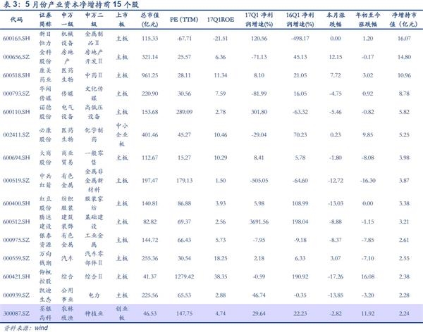 传媒5月增持一家独大,有色行业高管增持比例较高。5月传媒行业产业资本净增持8.84亿元,环比上涨937.46%,主要原因是华闻传媒控股股东国广资产大幅增持8.78亿。(自4月中旬以来华闻传媒股价持续下跌,大幅增持可能是为了稳定股价。)值得注意的是年初至今产业资本对于传媒行业偏好逐渐好转。考虑到自2015年底以来传媒行业估值不断下行( PE33.7,中位数48.68)且盈利能力强(2016年手游毛利率均值61.06%,电视剧毛利率均值42.12%),我们认为未来产业资本的态度将变得更加积极。此外,5月有色行业净增持额13.90亿元,较4月大幅增长13.91亿元。其中,高管增持占比高达64.41%(中金岭南、中孚实业等公司高管纷纷集体增持),一定程度上提振了市场信心。考虑到下半年电解铝供给或将进一步收紧且估值偏低(49.15,中位数58.08),不排除后续产业资本进一步增持的可能。