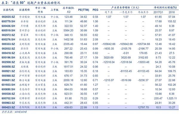 5月“漂亮50”加速减持,对后续行情影响并不大。我们选择市场比较公认21支白马股和龙头股作为 “漂亮50”的的研究样本。随着“漂亮50” 股价不断上升,产业资本减持行为逐渐明显,5月“漂亮50”产业资本净减持11.80亿元,较4月(-8.39亿元)加速减持。其中,减持主要集中在家电股(美的集团减持金额11.55亿元,占比85.89%;苏泊尔、老板电器等也有不同程度减持),医药股(复星医药等)则出现一定的增持。回顾历史,我们发现“漂亮50”产业资本配置情况基本稳定,另外一次较大波动分别出现在2016年4-6月。2016年4月美的集团高管以及美的员工持股计划大额增持15.84亿;5月美的集团股东融睿投资大幅减持30.26亿;6月东阿阿胶、永辉超市控股股东大额增持13.81亿、3.57亿。整体来看,产业资本对于“漂亮50”的配置基本保持稳定,也符合产业资本战略投资的风格与特征。结合行情来看,2016年、2017年的两次大额减持均是发生在消费股行情中,对于前者产业资本的减持对后期股价影响不是很大,对于后者我们认为本次减持并不会妨碍未来一段时间“漂亮50”仍然是资本较为偏好的投资对象。