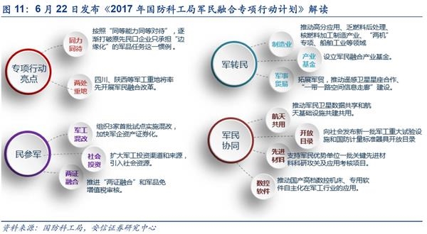 2017年将是军民融合从浅度到深度融合过渡期,顶层设计已经搭建,细化文件和地方文件将持续催化。2016年3月国防科工局《2016年国防科工局军民融合专项行动计划》发布,制定了军民融合政策制定方向,军民融合具体支持方向共计32条;2016年7月军民融合顶层文件《关于经济建设和国防建设融合发展的意见》印发,确定了军民融合的目标和基本原则;今年6月20日,中央军民融合发展委员会第一次全体会议召开,2日后国家国防科工局发布《2017年国防科工局军民融合专项行动计划》,明确了6个方面30项年度工作任务,军民融合战略进入细化落实阶段。近期军民融合相关事件如下: